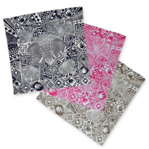 Tembo’s elephant print represents this family relationship–the matriarch in the center surrounded by her female herd. Along our border are lone elephants representing the males. All knitted together with patterning inspired by African mud cloth.